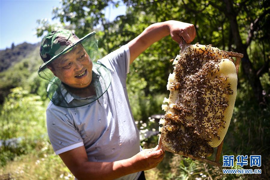 陕西汉中市留坝县火烧店镇天星亮村村民在展示扶贫社养殖的蜜蜂(7月2日摄)。秦岭生态资源丰富,具有得天独厚的蜜蜂养殖条件,但多年来山区农户自产自销的模式收益甚少。近年来,多地采取“农户+合作社”模式,让山区群众养蜂增收有了保障。新华社记者刘潇摄。