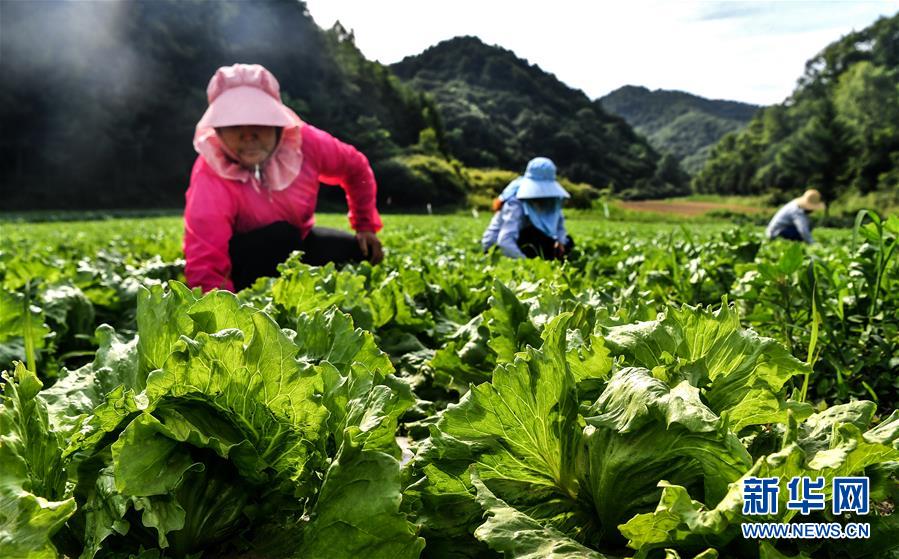 陕西宝鸡市太白县咀头镇塘口村的村民在菜地里劳作(7月4日摄)。近年来,地处秦岭腹地的陕西太白县利用海拔高、昼夜温差大等条件发展高山反季节无公害蔬菜种植。目前全县85%的群众从事蔬菜生产,种植的反季节高山蔬菜涵盖28大类390余种,畅销全国。新华社记者刘潇摄。