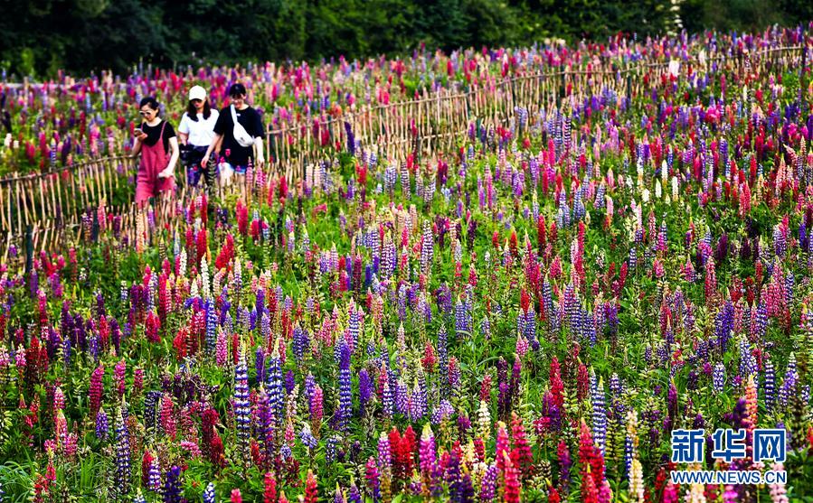 游客在陕西宝鸡市太白县咀头镇七里川村的鲁冰花产业园内观光游览(7月4日摄)。近年来,陕西地处秦巴山区的多个县市结合当地自然气候条件打造特色花海景观,利用“花海经济”助力脱贫攻坚和乡村振兴。新华社记者刘潇摄。