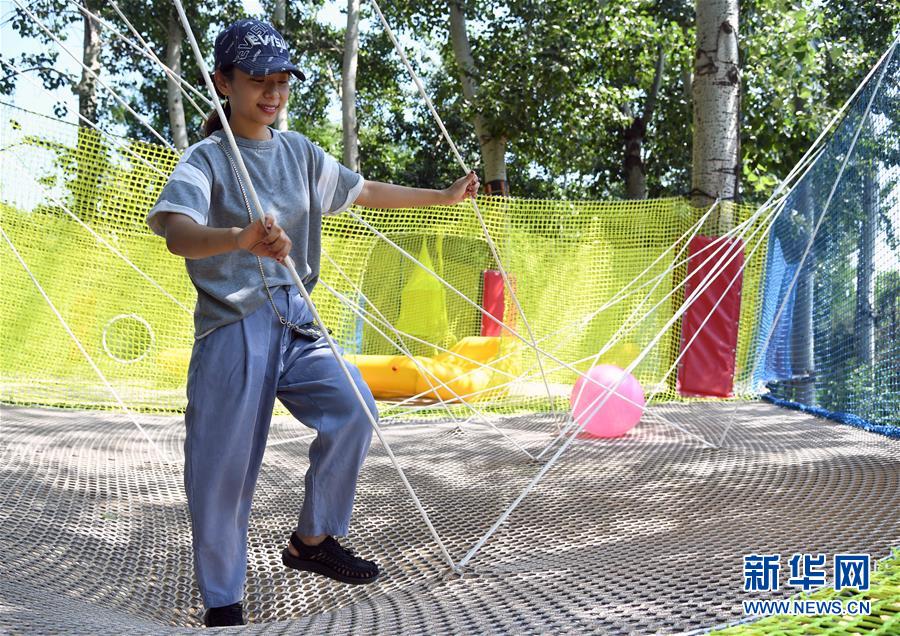 8月9日,市民在南宫五洲植物乐园体验“丛林网绳”。近期,在做好新冠肺炎疫情防控的前提下,位于北京市丰台区的南宫五洲植物乐园户外戏水区对外开放。市民在戏水的同时还可以在沙滩上画沙画、在新游乐项目“丛林网绳”里穿梭跳跃,丰富暑期生活。新华社记者任超摄。