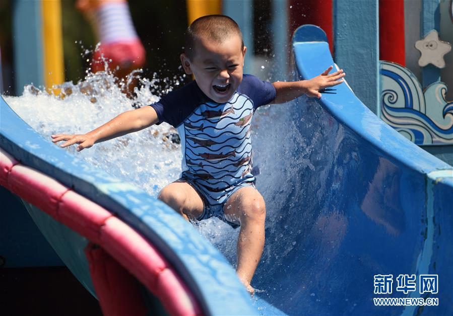 8月9日,一名小朋友在南宫五洲植物乐园户外戏水区游玩。近期,在做好新冠肺炎疫情防控的前提下,位于北京市丰台区的南宫五洲植物乐园户外戏水区对外开放。市民在戏水的同时还可以在沙滩上画沙画、在新游乐项目“丛林网绳”里穿梭跳跃,丰富暑期生活。新华社记者任超摄。