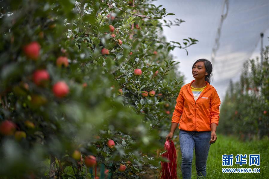 8月8日,昭通超越万亩苹果基地工人甄全米在苹果园工作。近年来,云南省昭通市确立以苹果产业为主导的现代农业产业发展战略。目前,该市苹果种植面积近80万亩,覆盖全市20余个乡镇,果农种植苹果年人均收入4000元以上,推动30多万果农依托苹果产业实现脱贫致富,半城苹果满城香的“苹果之城”正在乌蒙山区奋力崛起。新华社记者江文耀摄。