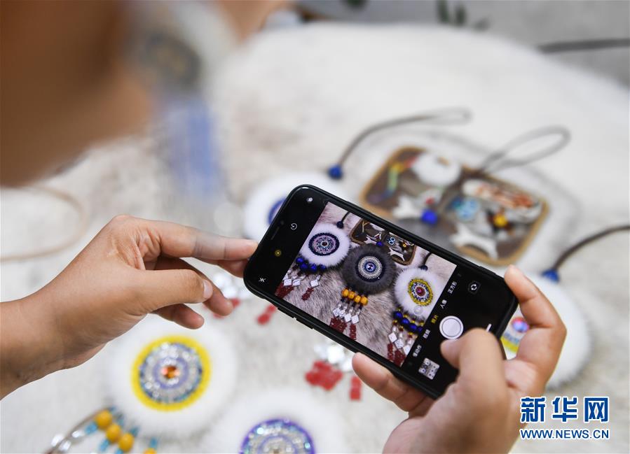 在内蒙古自治区鄂温克族自治旗巴彦托海镇太阳花传承发展中心,艾吉玛在拍摄手工艺品照片(8月7日摄)。新华社记者刘磊摄。