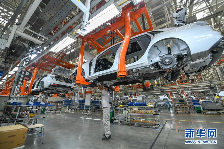 8月10日,在一汽-大众长春基地总装车间,工人在装配车辆。中国第一汽车集团有限公司7月销售整车32.2万辆,同比增长23.2%,延续上半年的增长态势。新华社记者张楠摄。