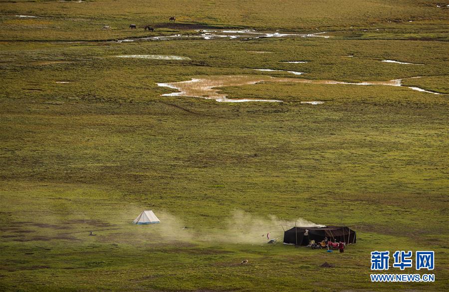 夕照下的泥拉坝湿地一角,炊烟袅袅(8月9日摄)。新华社记者江宏景摄。