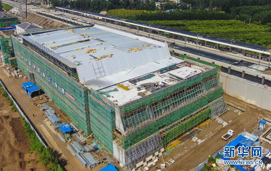 8月10日拍摄的建设中的京雄城际铁路霸州北站(无人机照片)。京雄城际铁路霸州北站站台雨棚混凝土结构施工日前全部完成,目前霸州北站已全面转入装饰装修和机电安装阶段,预计2020年底投入使用。京雄城际铁路是连接北京市区、大兴机场和雄安新区的重要干线。建成后,将进一步完善京津冀区域高速铁路网结构,便利沿线群众出行,对于推动京津冀协同发展和支撑建设雄安新区具有重要意义。新华社记者李晓果摄。