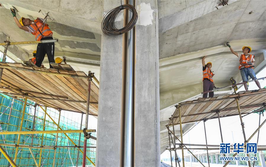 8月10日,工人在京雄城际铁路霸州北站建设工地为雨棚梁底抹腻子。京雄城际铁路霸州北站站台雨棚混凝土结构施工日前全部完成,目前霸州北站已全面转入装饰装修和机电安装阶段,预计2020年底投入使用。京雄城际铁路是连接北京市区、大兴机场和雄安新区的重要干线。建成后,将进一步完善京津冀区域高速铁路网结构,便利沿线群众出行,对于推动京津冀协同发展和支撑建设雄安新区具有重要意义。新华社记者李晓果摄。