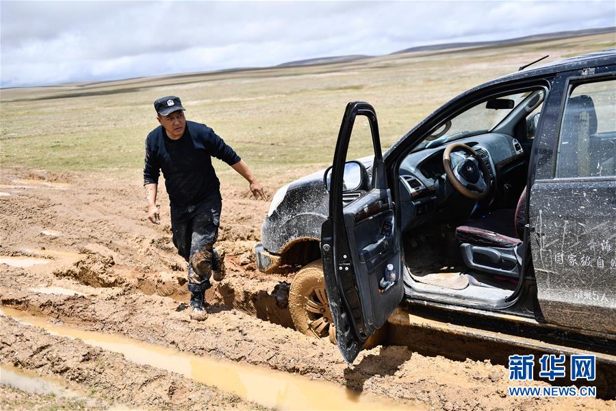 7月6日,卓乃湖保护站站长秋培扎西查看陷车情况。新华社记者张龙摄