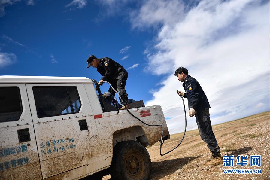 7月6日,巡山队员更松多杰(左)和白玛东周在可可西里地区为车辆加油。新华社记者张龙摄