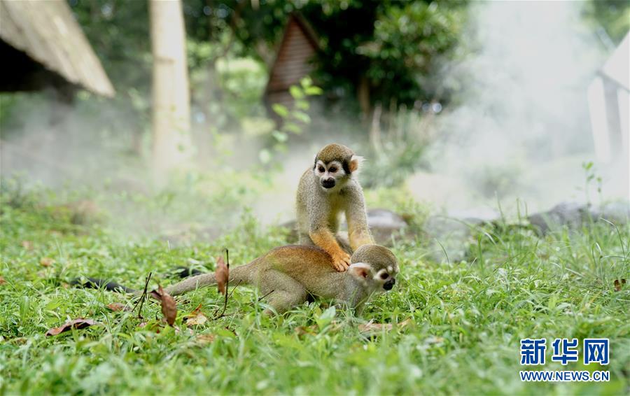 8月11日,上海动物园的松鼠猴在“地喷”营造的水雾中玩耍。当日,上海最高温度达到35摄氏度,上海动物园开启园内安装的各种喷淋装置,让动物们防暑降温,乐享清凉。新华社记者张建松摄