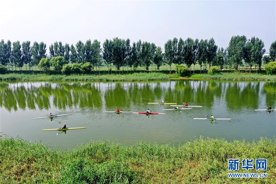 8月11日,廊坊市体育运动学校皮划艇训练队在龙河进行训练(无人机照片)。近年来,河北省廊坊市安次区统筹推进污水处理、饮水安全、景观提升等水环境综合治理工程,积极进行全域水生态建设,打造“水清、河畅、景美”的美丽水环境,为市民建设生态美好家园。新华社记者王晓摄