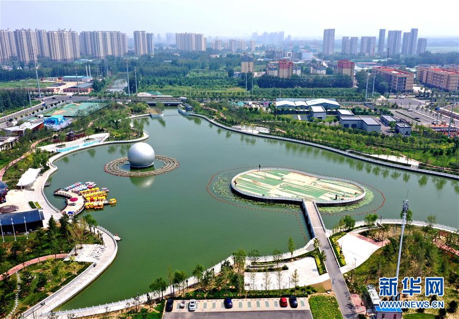 8月11日拍摄的廊坊市御龙河公园(无人机照片)。近年来,河北省廊坊市安次区统筹推进污水处理、饮水安全、景观提升等水环境综合治理工程,积极进行全域水生态建设,打造“水清、河畅、景美”的美丽水环境,为市民建设生态美好家园。新华社记者王晓摄