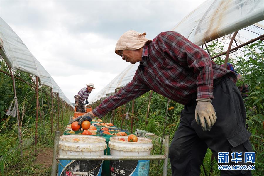 8月11日,在宁安市庆雨蔬菜专业合作社蔬菜产业园基地,工人把刚采摘下来的西红柿装入桶中准备运走。近年来,黑龙江省宁安市把设施蔬菜作为精准扶贫的主导产业来抓,组织吸纳贫困户贷资加入产业合作社,带动贫困户脱贫增收。宁安市将全市500余户贫困户的小额信贷资金集中投放到宁安市庆雨蔬菜专业合作社,建设蔬菜产业园基地,在带动贫困户脱贫增收的同时,壮大合作社蔬菜产业。新华社记者王建威摄。