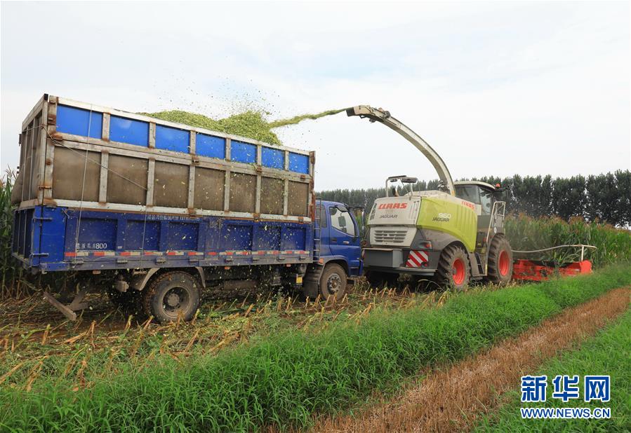 8月11日,滦南县马城镇湛店子村的农民使用大型机械收获青贮玉米。近日,河北省滦南县的12万亩青贮玉米陆续开始收获,为当地奶牛养殖提供新鲜优质饲料。作为河北省奶牛养殖大县,滦南县近年来大力推广奶牛青贮玉米喂养模式,引导农民种植青贮玉米,促进农民增收。新华社记者杨世尧摄