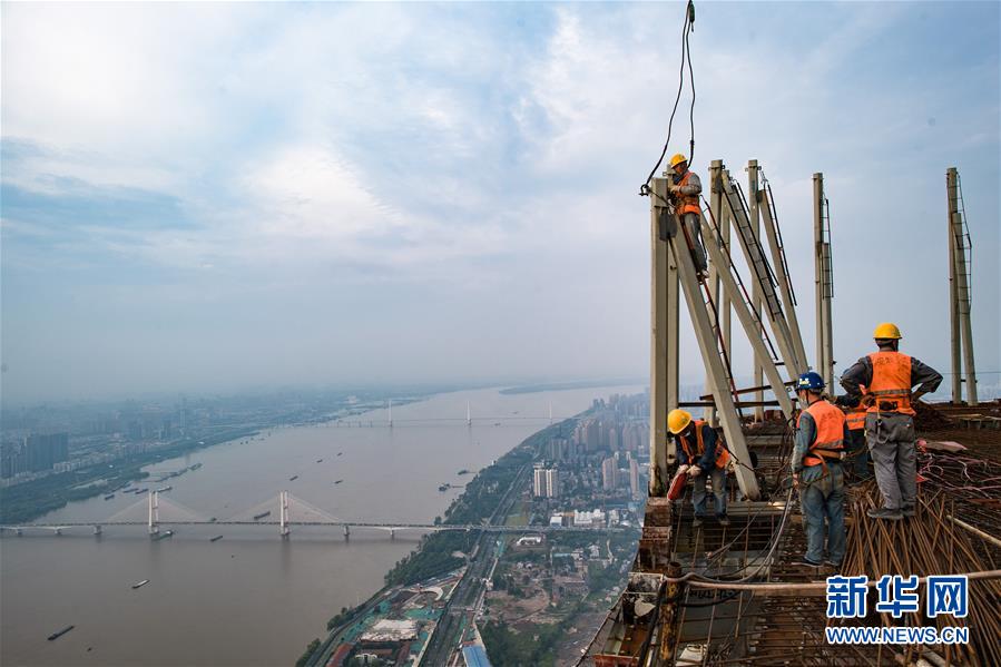 8月11日,工人在武汉绿地中心项目建设现场近500米的高空施工。新华社记者肖艺九摄