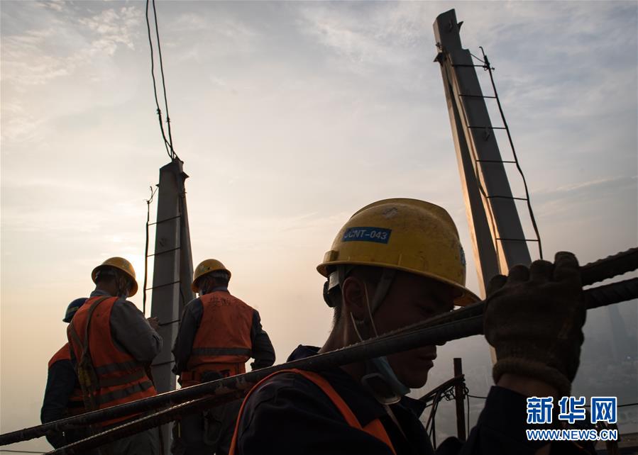 8月11日,工人在武汉绿地中心项目建设现场近500米的高空施工。新华社记者肖艺九摄