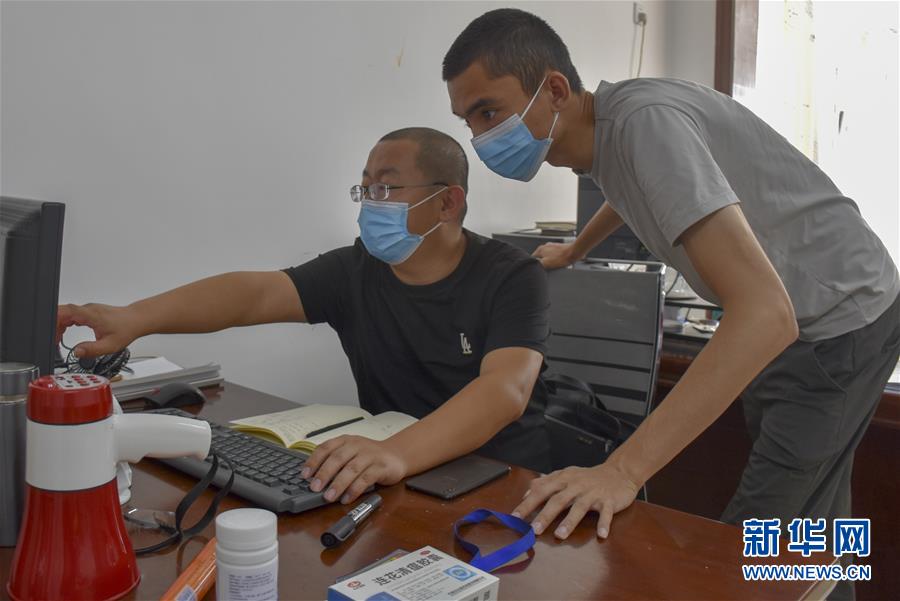 8月12日,乌鲁木齐市天山区山西巷社区工作人员王志鹰(左)与同事沟通工作事宜。新华社记者 高晗 摄