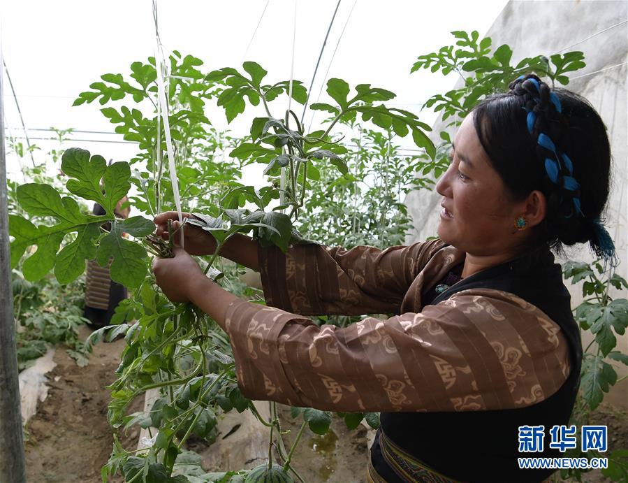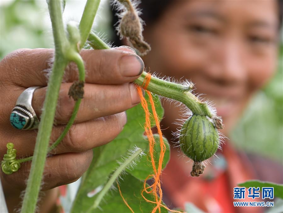 格桑旺姆姐妹家大棚内的瓜秧上结出的小西瓜(8月2日摄)。新华社记者 李贺 摄