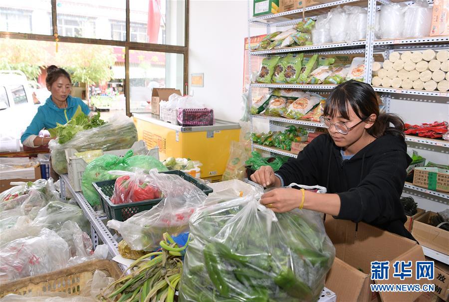 格桑旺姆(右)和姐姐德吉卓玛在位于白朗县的蔬菜店内忙碌(8月3日摄)。新华社记者 李贺 摄