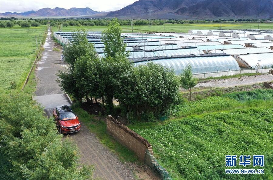 姐妹俩开着刚买的小汽车将大棚出产的蔬菜运往县里的店铺(无人机照片,8月3日摄)。新华社记者 李贺 摄