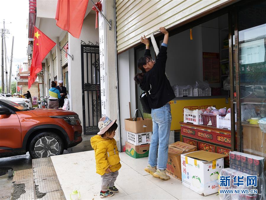 格桑旺姆推开蔬菜店的卷闸门准备营业(8月3日摄)。新华社记者 李贺 摄