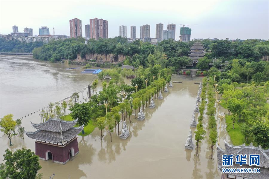 8月12日,重庆市潼南区大佛寺景区,涪江洪水淹没景区广场(无人机照片)。受强降雨影响,涪江潼南段迎来过境洪水。截至12日下午5时,涪江潼南城区段最高水位238.5米,超警戒水位0.5米,低于保证水位(240米)。此次过境洪水导致潼南区部分场镇低洼地段局部进水,约2700亩农作物不同程度受灾。新华社记者 黄伟 摄
