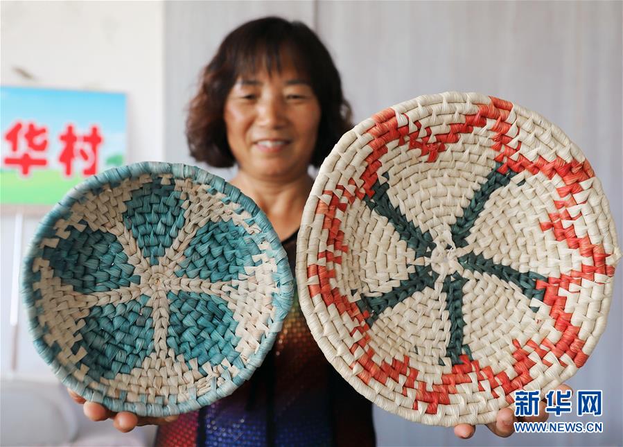 8月12日,一名村民在展示草编工艺品。新华社记者 雒圆 摄