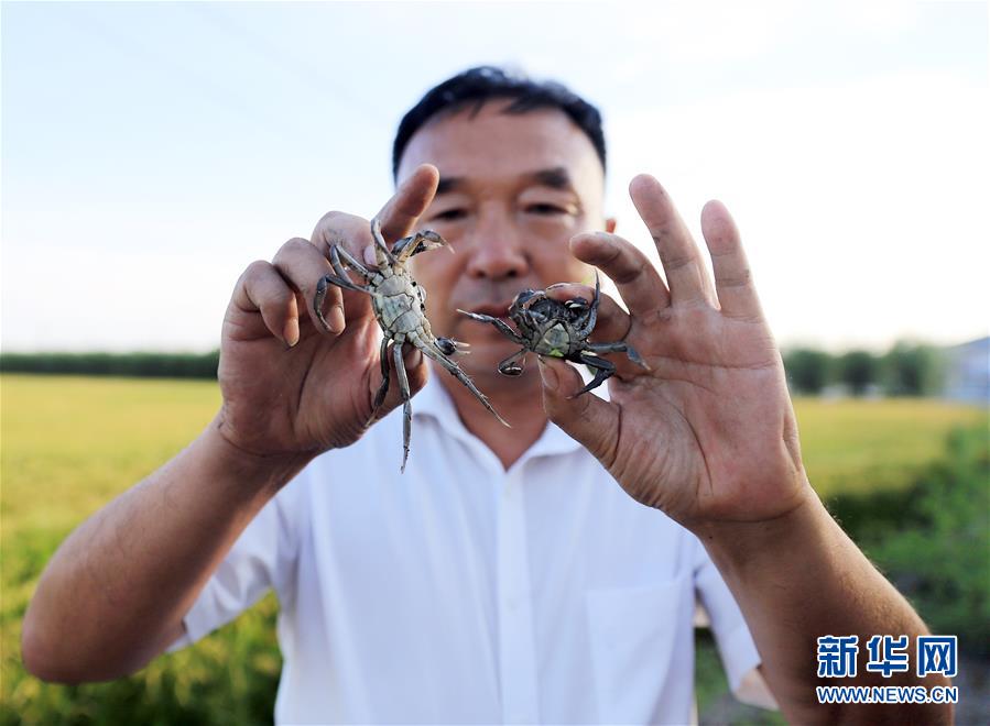 8月12日,春华村党支部书记董为春展示从水稻田中捕捞的稻田蟹。新华社记者 雒圆 摄