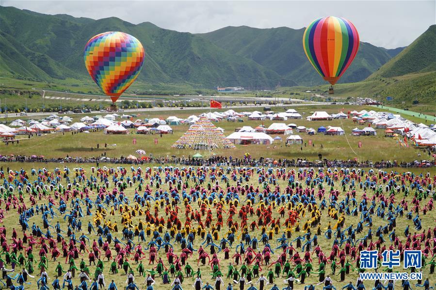 8月12日,身着节日盛装的演员和当地群众在夏泽滩草原上跳起锅庄舞。新华社记者 黄泽民 摄