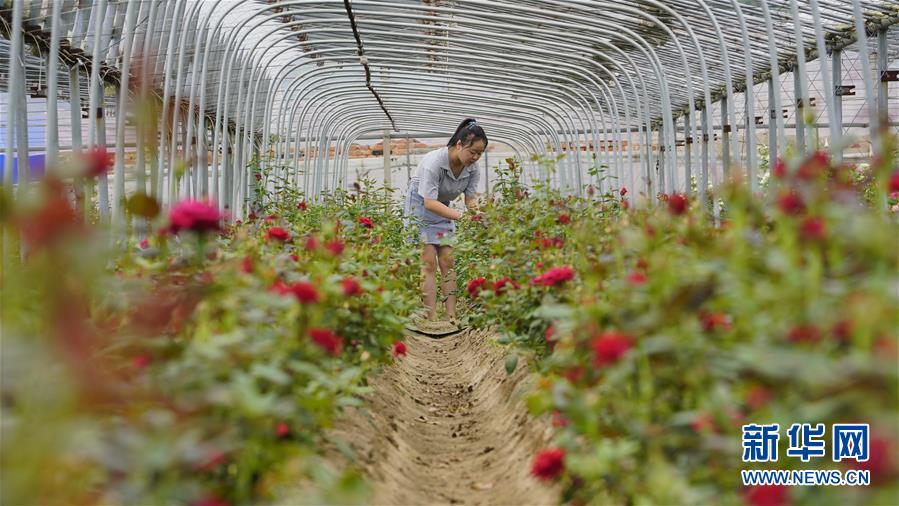 8月12日,河北省滦州市茨榆坨镇谢各庄村花农在查看玫瑰长势。新华社记者 牟宇 摄