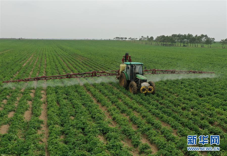 8月12日,在尚义县三工地镇有德元村,农民使用机械设备在田间给旱作马铃薯喷洒农药(无人机照片)。