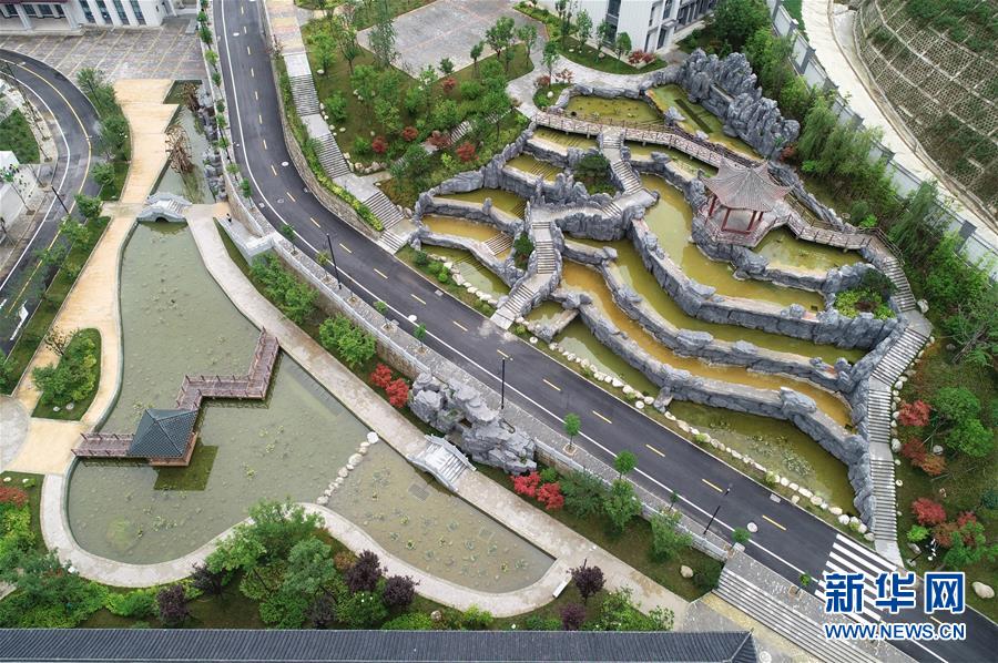 镇安县镇安中学多级瀑布群与水池栈道凉亭景观(7月30日摄,无人机照片)。新华社记者邵瑞摄