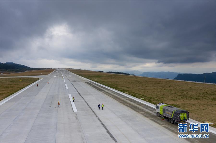 8月12日,校飞正式开始前一天,工作人员对仙女山机场跑道路面进行清洁(无人机照片)。8月13日,位于重庆武隆区的仙女山机场飞行校验工作正式开始。据介绍,重庆仙女山机场校飞时间大约需3至5天。重庆仙女山机场于2018年4月全面开工,机场跑道长2800米、宽45米,航站楼总面积6000平方米,投用后可满足每年60万人次的旅客吞吐量。新华社记者刘潺摄