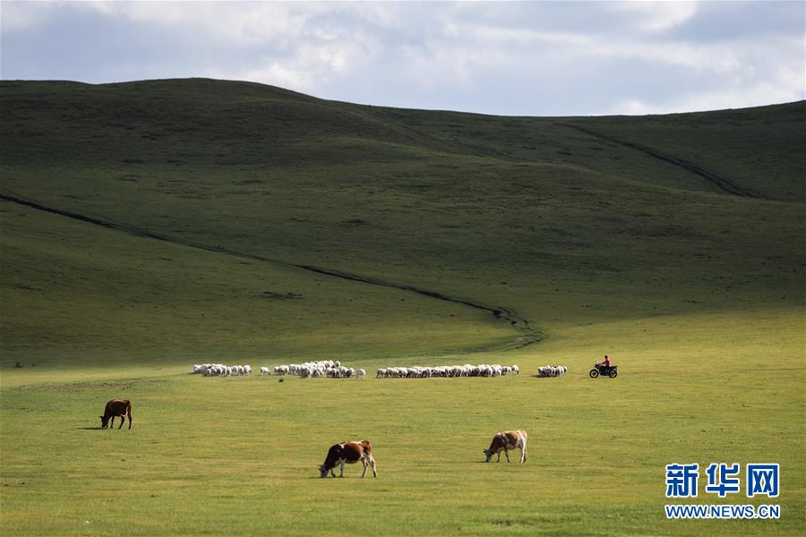 牧民在克什克腾旗贡格尔草原放牧(8月11日摄)。克什克腾旗位于内蒙古自治区赤峰市西北部,境内的湖泊、河流、草原、森林等自然景观,让人们流连忘返。新华社记者刘磊摄