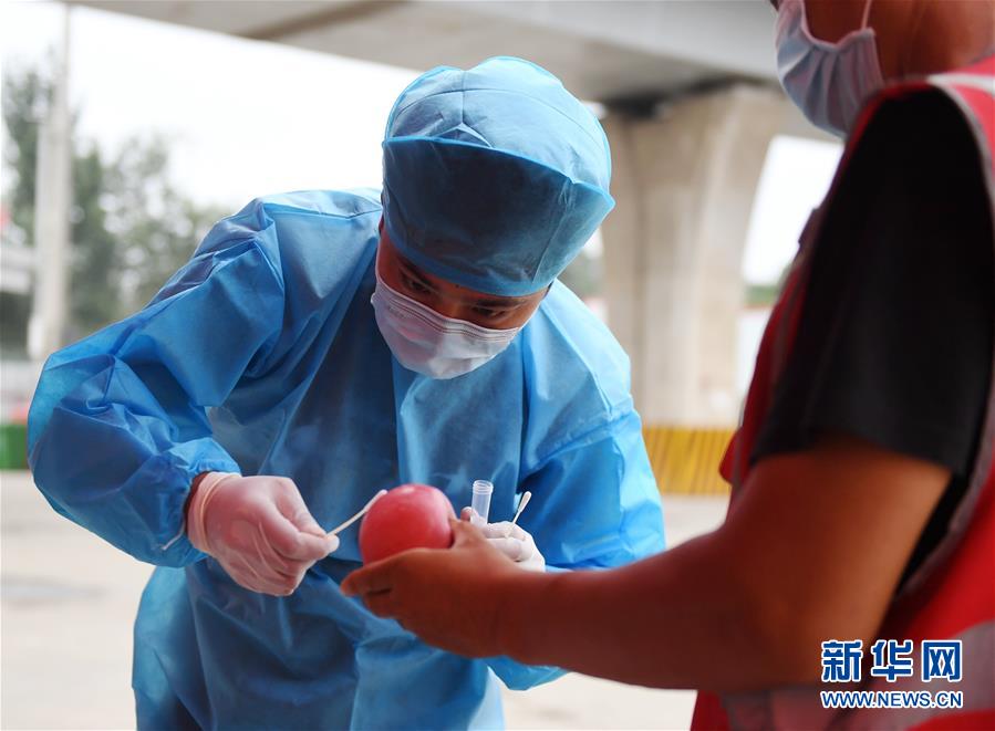工作人员在新发地批发市场周转新区对进场车辆进行取样(8月6日摄)。 新华社记者 张晨霖 摄