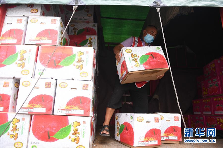商户在新发地批发市场周转新区卸下苹果(8月6日摄)。 新华社记者 张晨霖 摄
