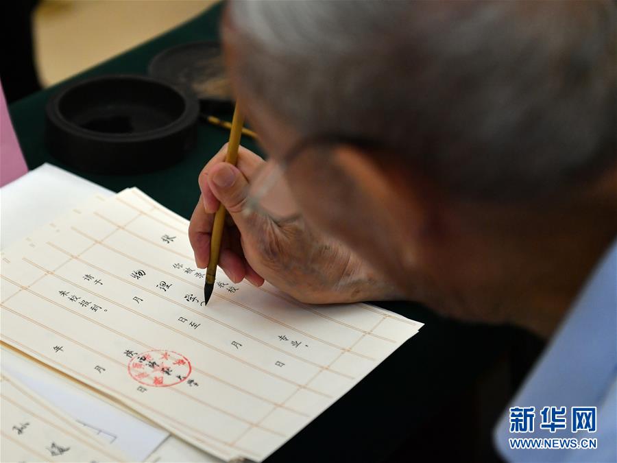 8月13日,陕西师范大学退休教师符有堂书写录取通知书。当日,陕西师范大学2020年手写录取通知书正式开笔。该校自2007年起采用毛笔书写录取通知书的方式,为新生传递佳音。今年,学校十余位退休教师、在职教师、校友代表等书法爱好者将为约4500名新录取的本科生送上带着墨香的大学录取通知书。新华社记者张博文摄
