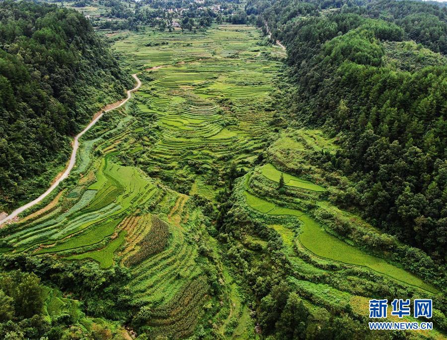 这是8月13日拍摄的鞍子镇大林村梯田景色(无人机照片)。时下,重庆市彭水苗族土家族自治县鞍子镇大林村的梯田景色迷人,构成一幅幅山乡田园美景。新华社记者王全超摄