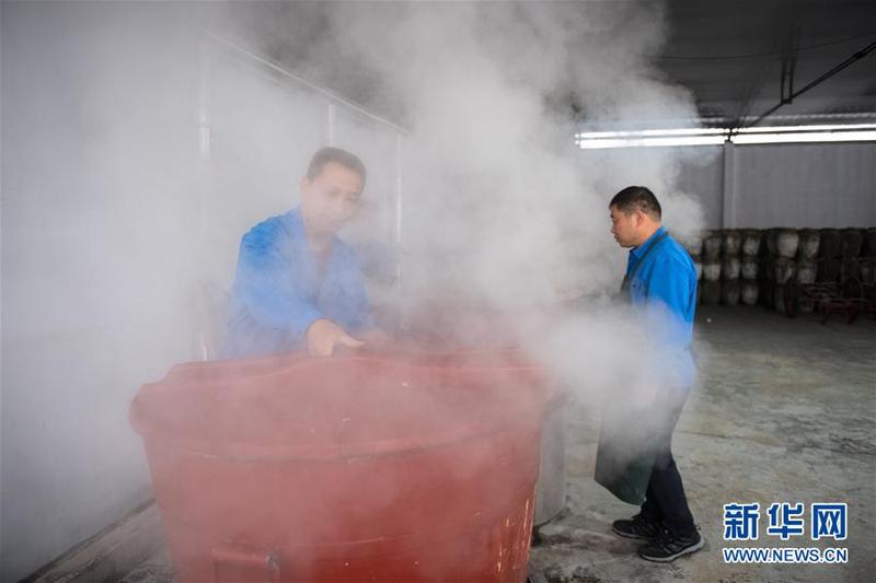 11月21日,工作人员在绍兴女儿红酿酒有限公司厂房蒸煮糯米。 浙江绍兴一带有“生女酿好酒、婚嫁宴宾客”的习俗,所酿之酒称“女儿红”。在绍兴市上虞区东关街道,一家酿酒厂仍保留着传统的黄酒生产线,恪守着近20道酿造工序,延续着传统黄酒的酿制技艺和生女必酿“女儿红”的文化习俗。 黄酒是中国最古老的酒种之一,传统黄酒仅在冬季取鉴湖水和糯米酿制,所得之酒澄澈馥郁。 新华社记者翁忻旸摄