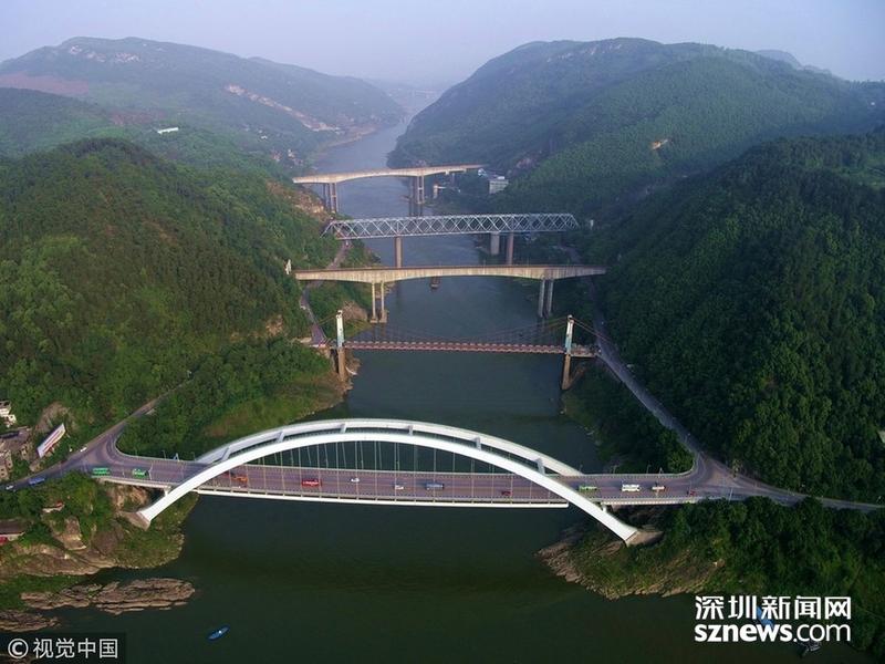 画面中由近及远分别是新朝阳桥、老朝阳桥、遂渝铁路桥、襄渝铁路桥、兰渝铁路桥。