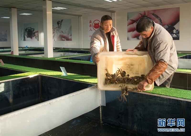12月17日,在湖州市吴兴区高新区庙港人千亩水产园,蟹农将捕捞的大闸蟹投入暂养池,等待包装。 新华社记者翁忻旸摄