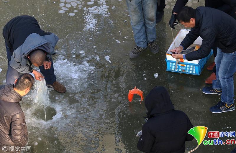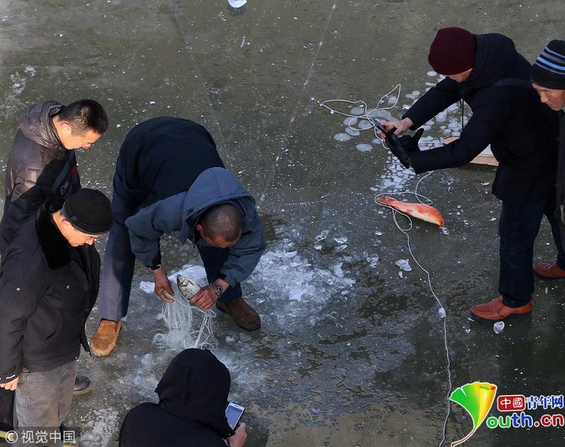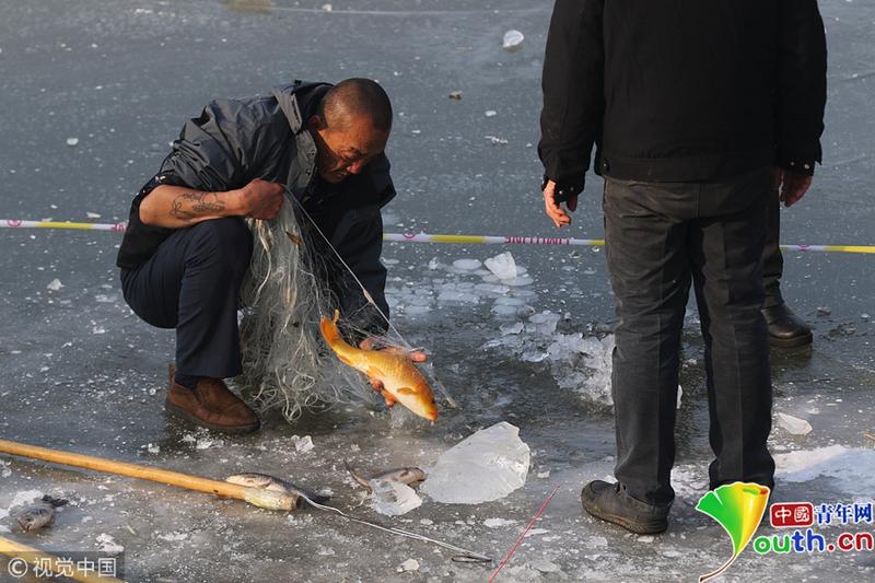 2018年11月25日,黑龙江省哈尔滨市,松花江封江不久,已经有人蹬江凿冰下网捕鱼。 图片来源:视觉中国