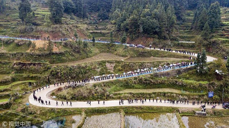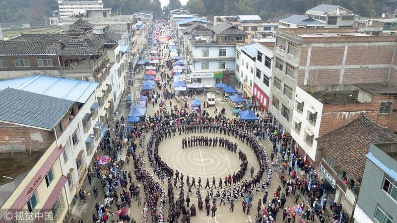 2018年11月19日,侗族同胞在参加贵州省从江县庆云镇“冻鱼节”踩歌堂。(无人机拍摄)
