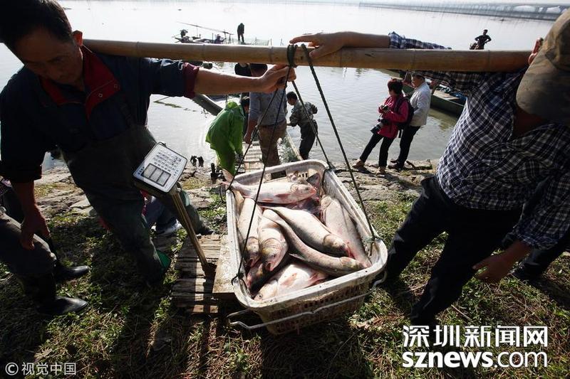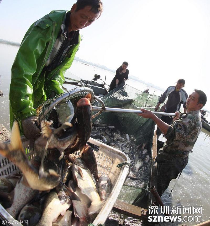 深圳新闻网讯 江苏扬州,邗江区公道镇南湖村南湖水域,专业捕捞队人员已集结到胡登强养殖户家鱼塘进行捕捞作业。据捕捞队员沈昌田介绍,近期随气温转冷,鱼的销量增加,水产养殖户纷纷捕鱼上市,为赶在上午10时将鱼运到水产批发市场销售,专业捕捞队员们天不亮就起床,下河塘布围网、收网捞鱼、过秤装车。一周捕捞作业有三四次之多,一次捕捞多达上万斤鱼。公道镇有水面滩涂6.5万亩,是鱼、虾、蟹、等水产品养殖的理想场所。