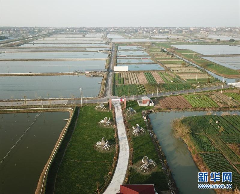 俯瞰湖州市吴兴区高新区庙港人千亩水产园(12月17日无人机拍摄)。在庙港人千亩水产园,太湖水被引入内塘中,目前已形成完善的蟹苗培育、成蟹养殖功能区。 新华社记者翁忻旸摄