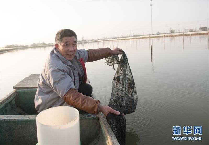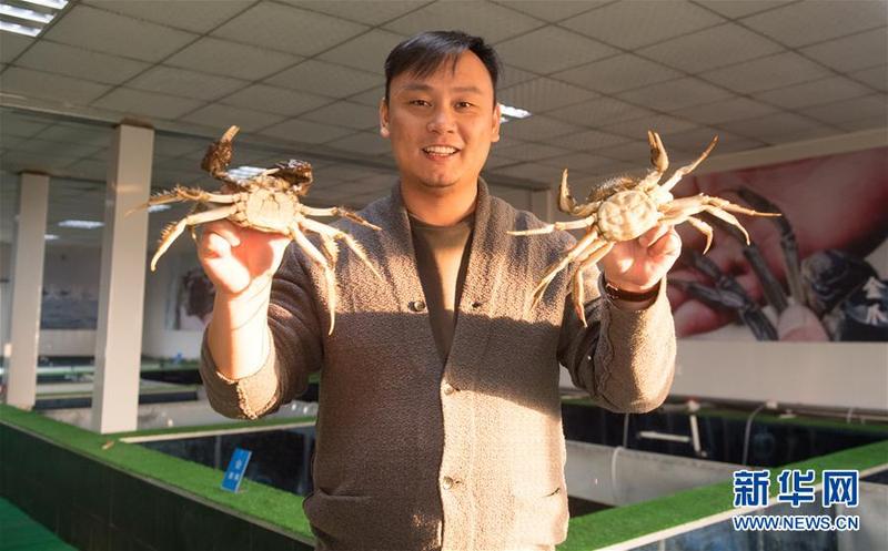 12月17日,在湖州市吴兴区高新区庙港人千亩水产园,水产园负责人展示内塘养殖的大闸蟹。 新华社记者翁忻旸摄