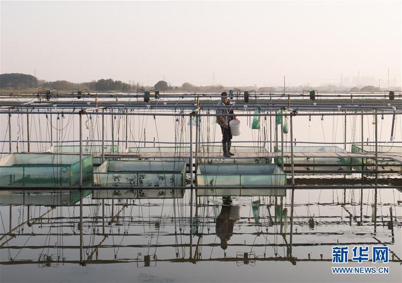12月17日,在湖州市吴兴区高新区庙港人千亩水产园,蟹农给大闸蟹投喂玉米。 新华社记者翁忻旸摄