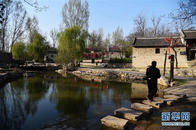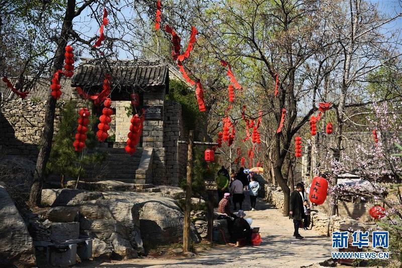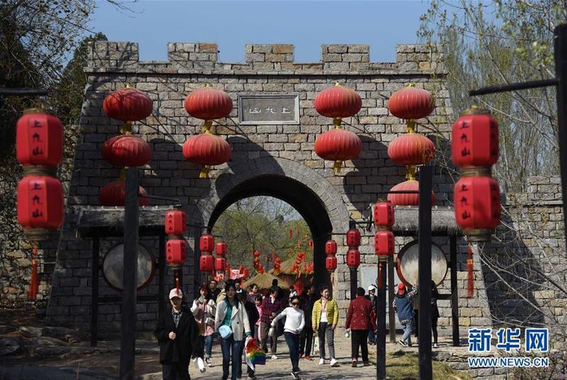3月31日,游客在上九山村入口处游览。山东省邹城市石墙镇上九山村始建于宋代,是一座依山而建的石头村,有明清建筑风格的古民居300余套,古朴传统的村貌吸引众多游客。2019年1月,上九山村入选第七批中国历史文化名村。 新华社记者 王凯 摄