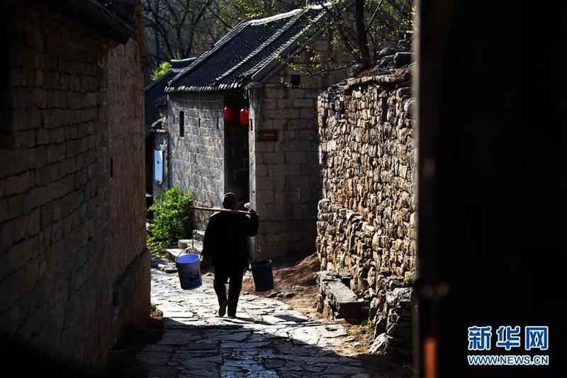 3月31日,村民挑担走在上九山村的一条小道上。山东省邹城市石墙镇上九山村始建于宋代,是一座依山而建的石头村,有明清建筑风格的古民居300余套,古朴传统的村貌吸引众多游客。2019年1月,上九山村入选第七批中国历史文化名村。 新华社记者 王凯 摄