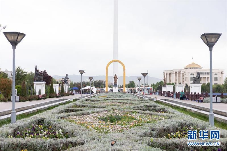这是4月13日在塔吉克斯坦首都杜尚别市中心拍摄的花坛。 新华社记者白雪骐摄